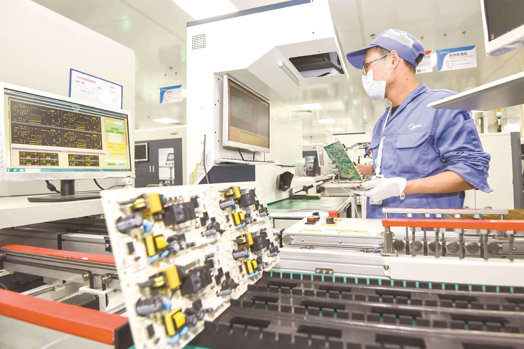 企业生产车间,工人正在操作智能化流水线设备。