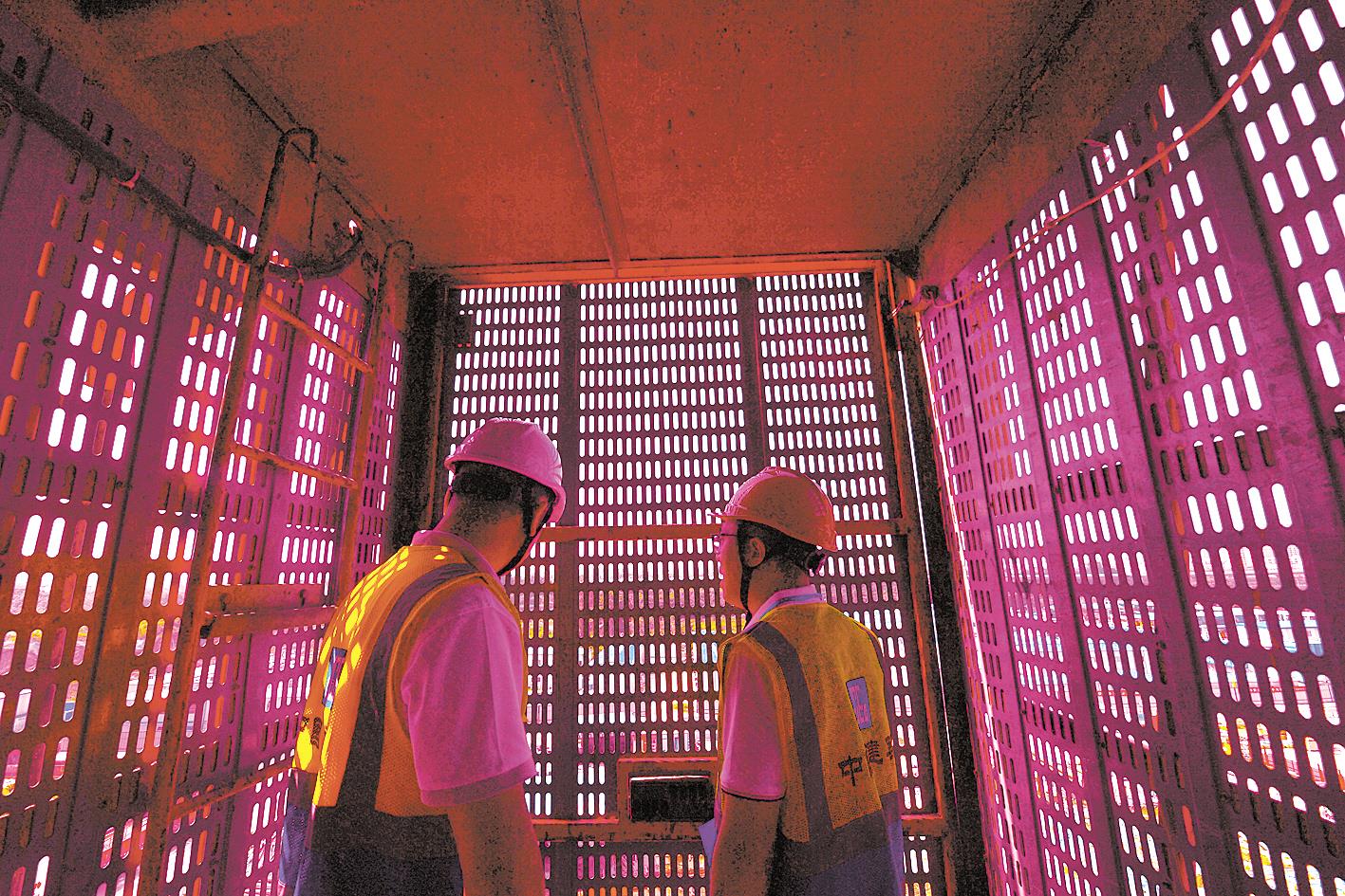 乘坐工地施工电梯上下巡查,是王秉乾(右)每天必不可少的“作业”。
