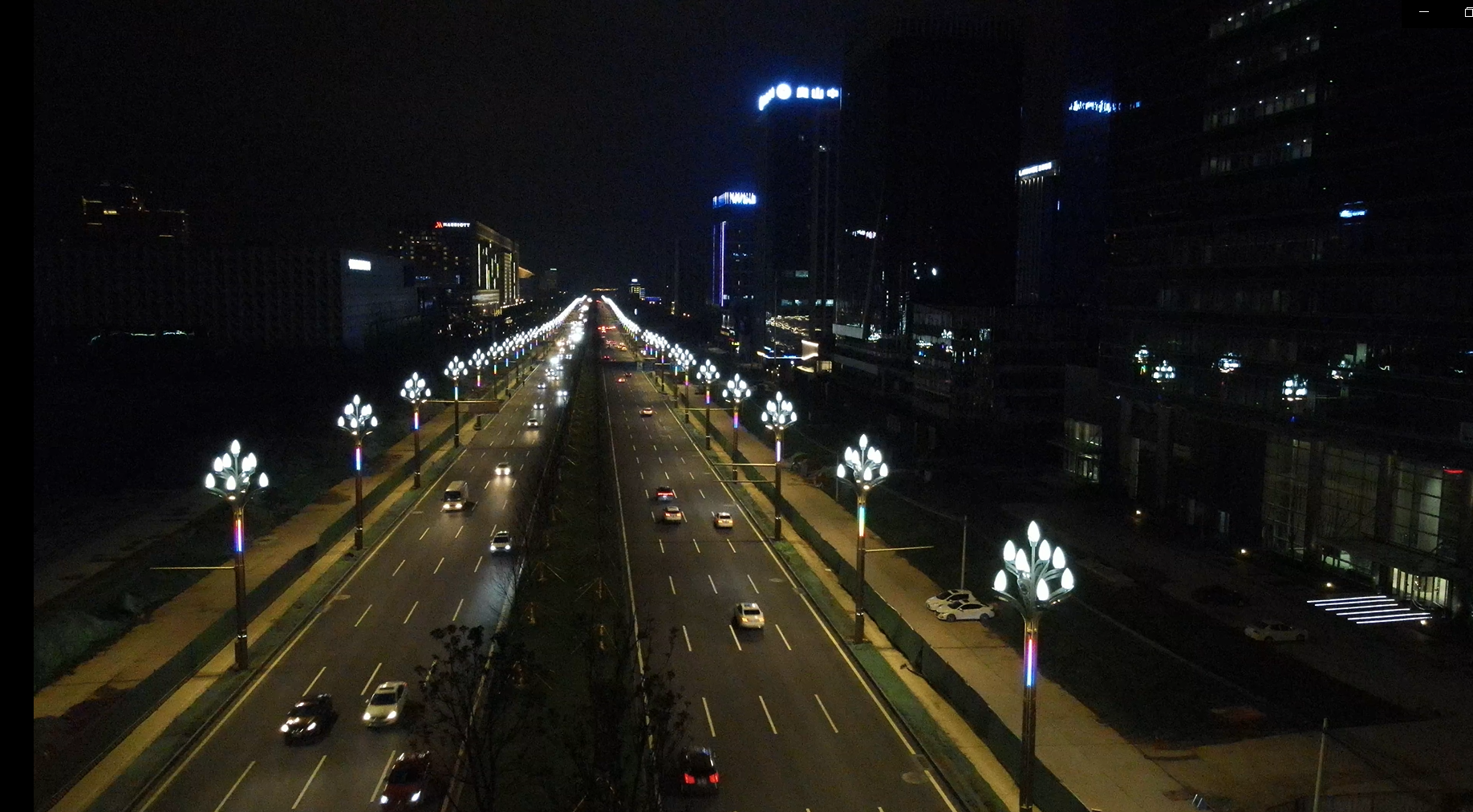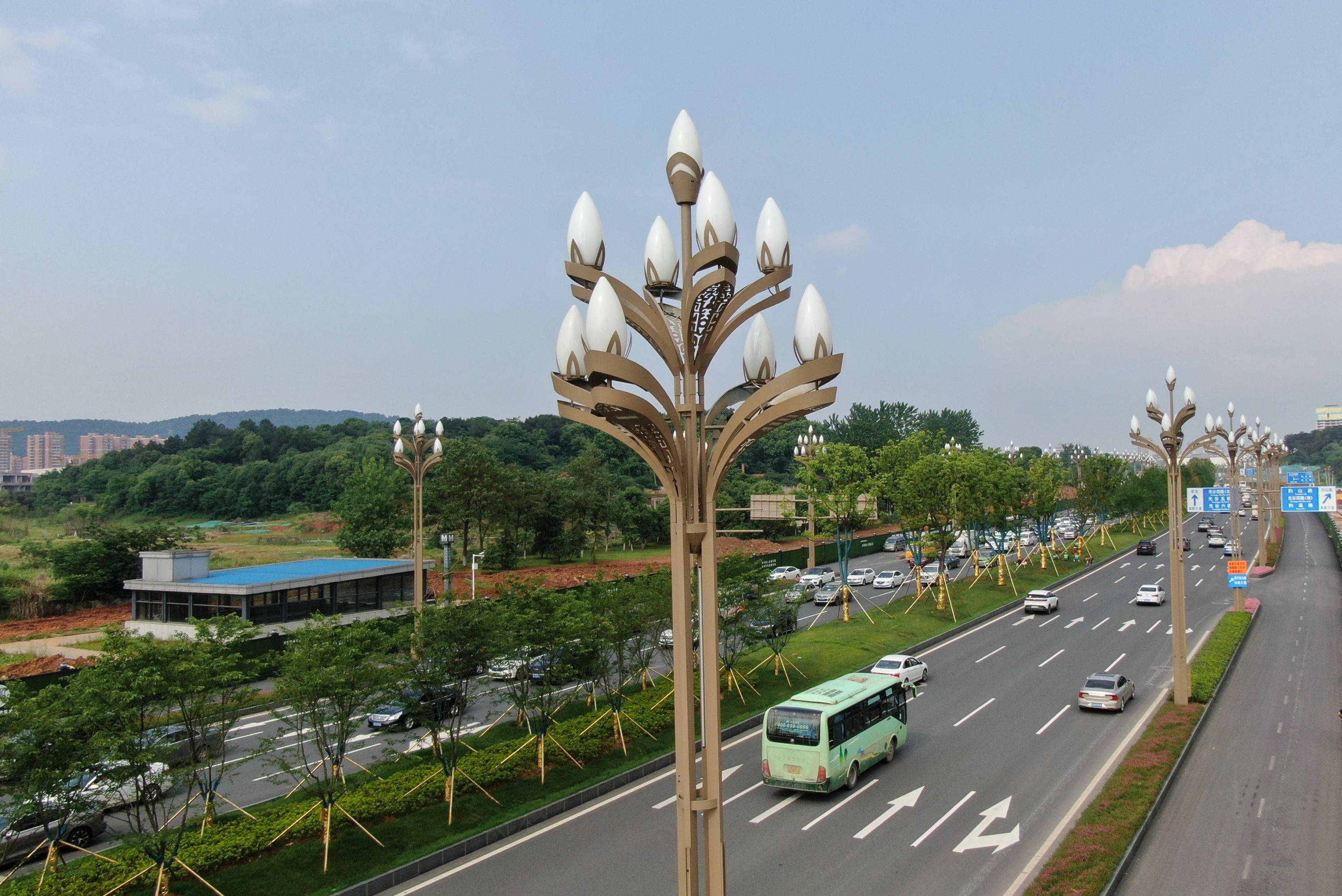 高新大道全线路灯采用智慧路灯,多杆合一,设计将5G设施、电子显示屏、交通指示牌、交管监控设备等全部集成在路灯杆上。