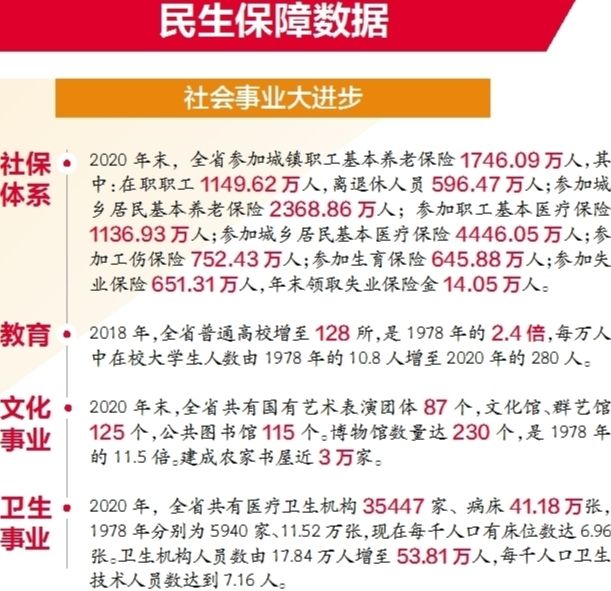 维护人民健康安全、推进公共卫生治理现代化。截至2020年,全省共有医疗卫生机构3.5万余家,卫生健康从业人员53.81万人,开放床位41.18万张;群众健康水平持续提升,人均期望寿命从新中国成立初期的35岁增长到78岁,婴儿和孕产妇死亡率则分别控制在4‰和11/10万以下,领先中西部地区。城乡居民健康素养水平从10.7%提高到25.5%。