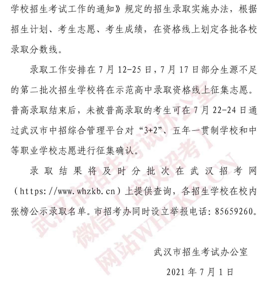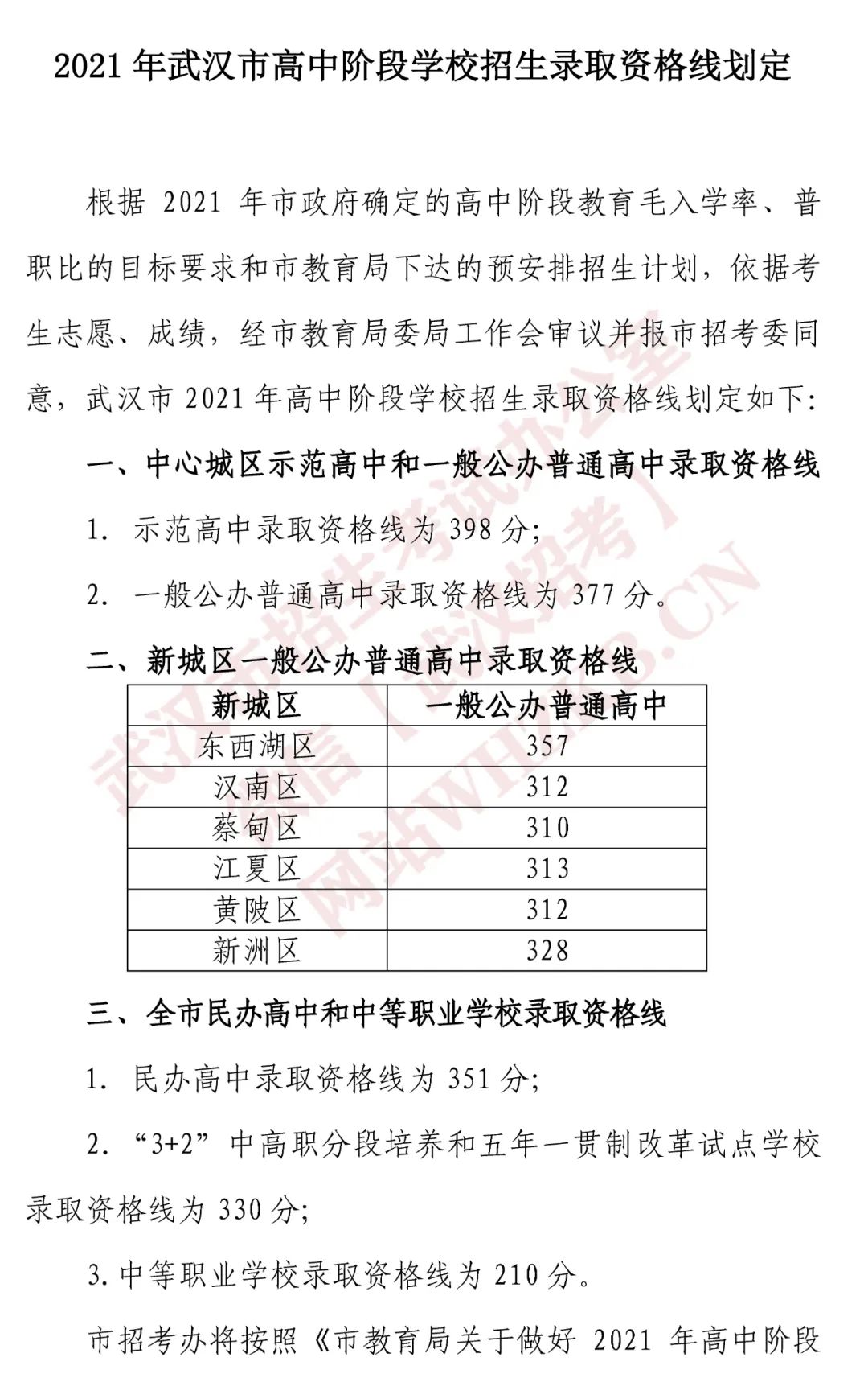 刚刚,武汉市招生考试办公室发布了“2021年武汉市高中阶段学校招生录取资格线划定”公告,具体如下: