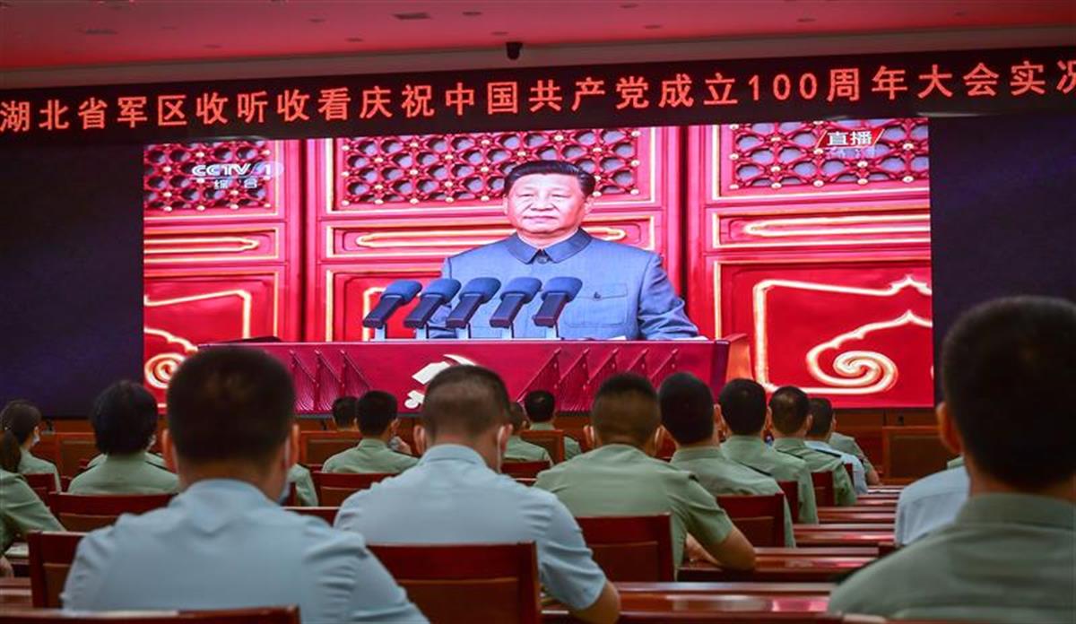 7月1日,湖北省军区各级纷纷通过各种形式观看了庆祝中国共产党成立100周年大会实况,聆听习近平总书记的重要讲话。一条条振奋人心“金句”,点燃了广大官兵壮志豪情。