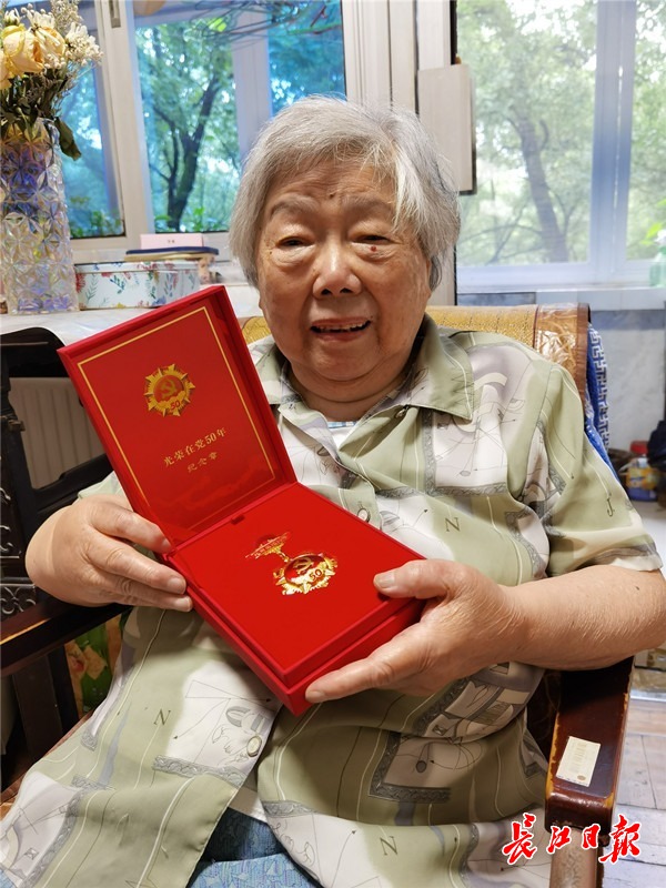 赵施光收到光荣在党50年的纪念章。 长江日报记者杨佳峰 摄