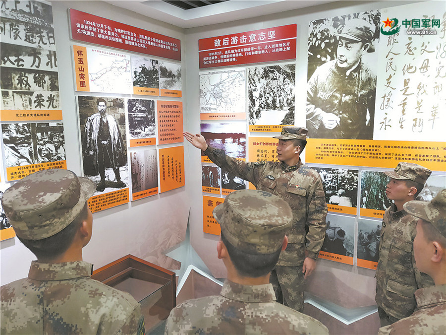 第80集团军某旅“红六连”将党史学习教育课堂搬进荣誉室,帮助官兵直观形象地学习党史知识。图为指导员王琳(右三)正在为刚下连的列兵讲述连队光荣传统。常皓博摄