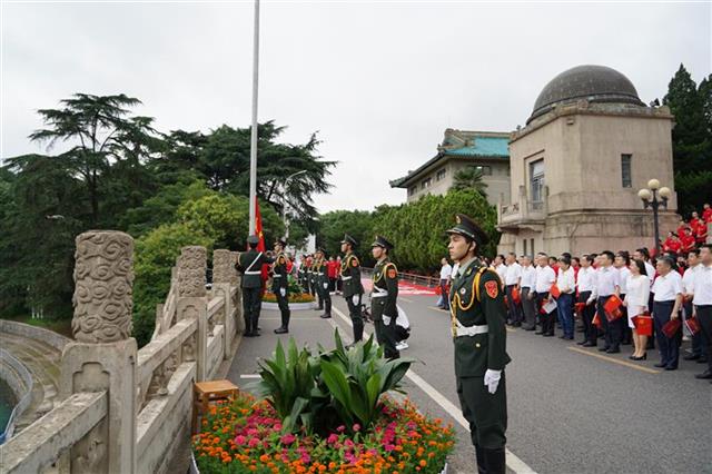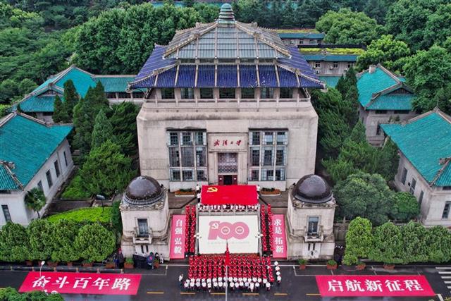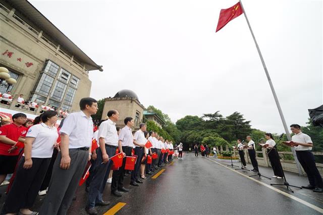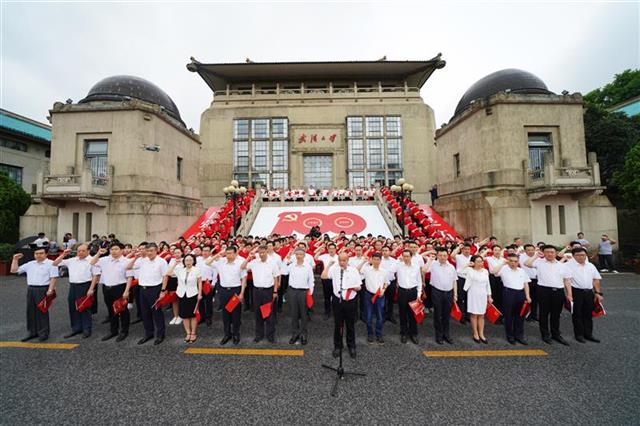 湖北日报讯(记者文俊 通讯员吴江龙、肖珊)“请右拳紧握过肩!”7月1日清晨,武汉大学行政楼前,庄严的国歌声响起,国旗护卫队升起鲜艳的五星红旗,在武汉大学校长窦贤康带领下,该校新发展师生党员进行入党宣誓,在场全体党员同志,共同重温入党誓词,共同庆祝中国共产党百年华诞。