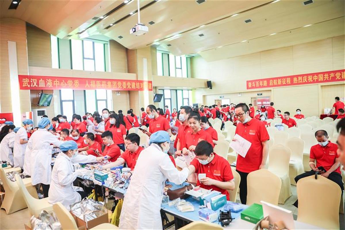 “迎建党百年,献一腔热血!” 2021年7月1日,人福医药集团与武汉血液中心联合开展“党旗飘扬,热血人福”无偿献血公益活动。人福医药集团及下属公司党员和员工积极响应,踊跃参加了这次无偿献血活动,以实际行动践行初心、奉献爱心。活动当天,200多名党员职工参与献血,143人成功献血,献血总量达3.77万毫升。