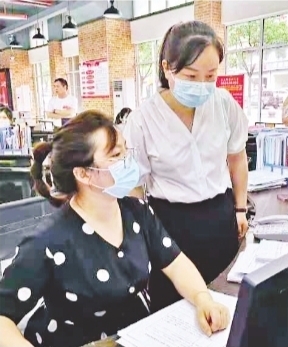 青山区工人村街道青和居社区党委书记桂小妹(右)正在询问网格员近期居民疫苗接种的情况。