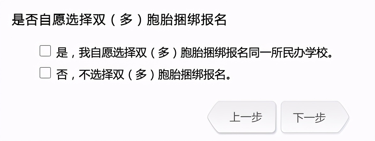 上一步骤勾选“同意”的,点击“下一步”后,系统将提示:“是否自愿选择双(多)胞胎捆绑报名”,在选项中进行勾选,点击“下一步”,勾选“是”将继续进行双(多)胞胎捆绑报名,勾选“否”将返回普通报名。