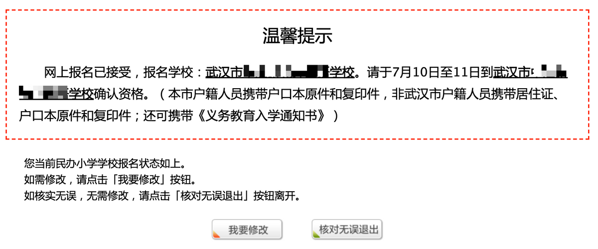 选择民办小学且已完成网上报名的新生,须于7月10-11日到学校确认资格。本市户籍人员携带户口本原件和复印件,非武汉市户籍人员携带居住证、户口本原件和复印件等资料;为提高审核效率,建议携带《义务教育入学通知书》。