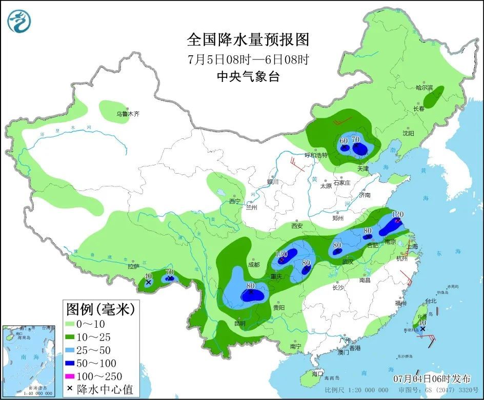 7月5日8时至6日8时,华北中北部、黄淮南部、江淮、江汉、西南地区东部和南部、台湾岛等地的部分地区有中到大雨,其中,西藏东南部、河北北部、北京北部、安徽中部、江苏中部、湖北东部和西南部、四川南部和东北部、重庆北部、云南东北部等地局地有暴雨或大暴雨。