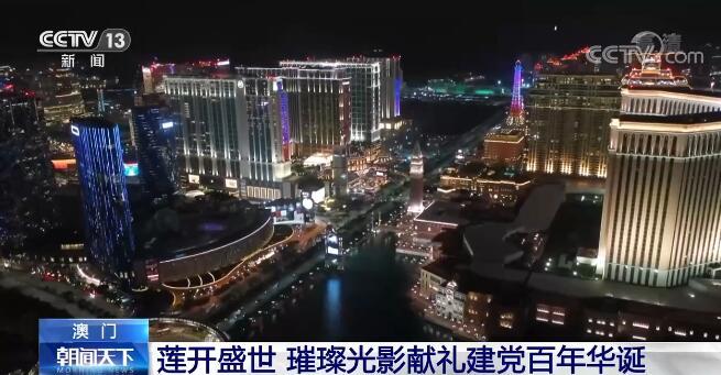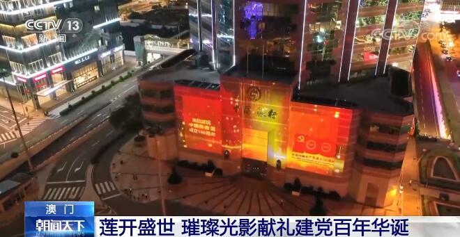 总台记者 肖中仁: 我所在的位置是澳门重要的交通枢纽——亚马喇前地,在中国共产党迎来百年华诞,举国欢庆的美好时刻,在我的身后,一场主题为“百年风华 莲开盛世”的光影秀正在上演。