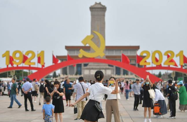 7月1日庆祝中国共产党成立100周年大会胜利召开后,仍保留中国共产党党徽年号、广场两侧旗阵、大屏幕、毛主席纪念堂两侧花卉绿地景观、正阳门城楼北侧花卉绿地景观、党徽年号周围花卉绿地景观,以及广场两侧“海浪纹”花卉绿地景观。各界群众纷纷踊跃前往天安门广场参观,重温庆祝大会激动人心的时刻。