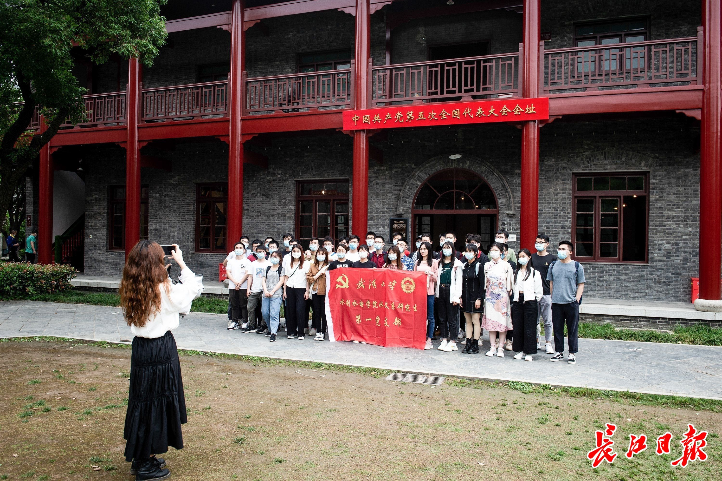 5月12日,参观者在武汉中共五大会址纪念馆拍照留念。