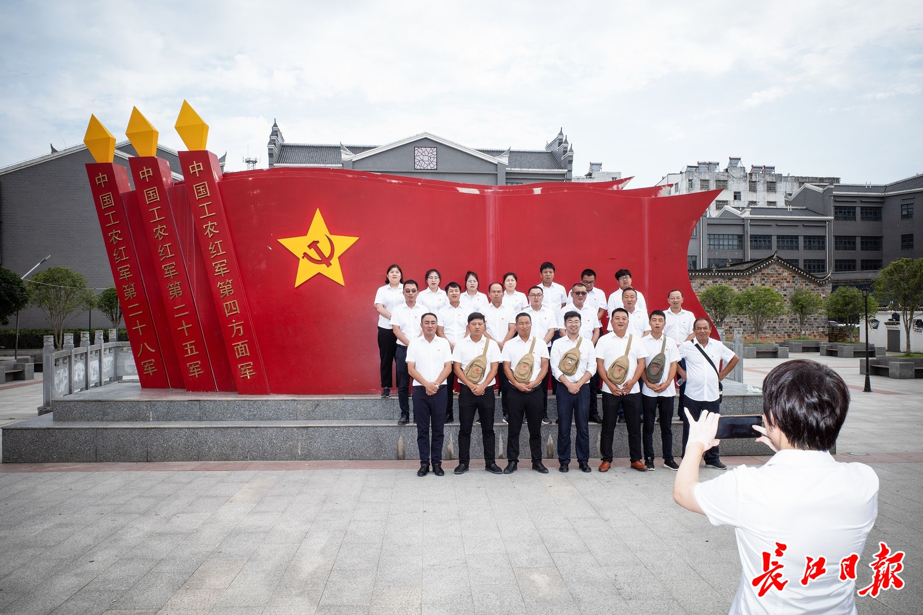 6月20日,在湖北红安县长胜街红四方面军总指挥部旧址附近,参观者与党旗雕塑合影。