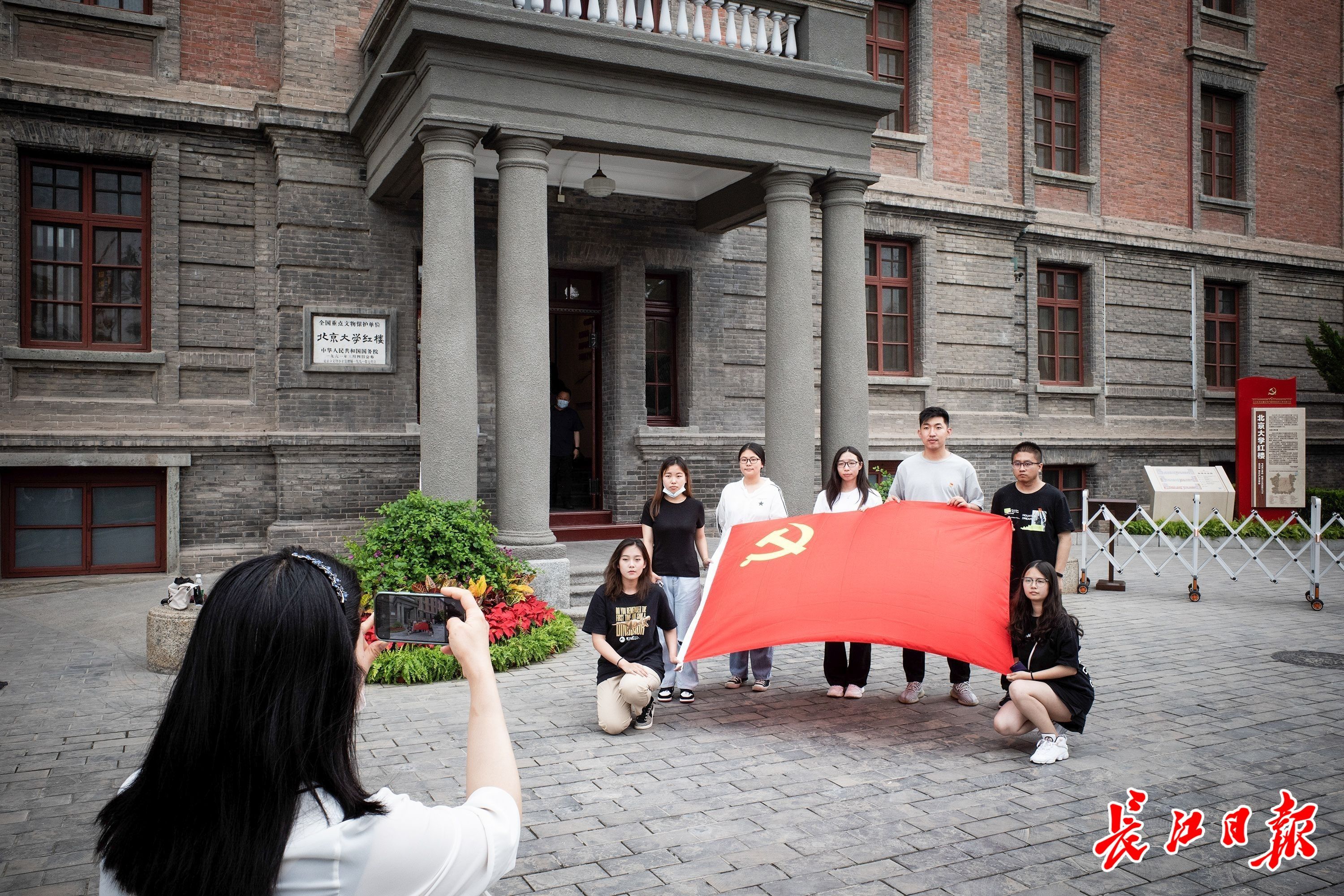 6月29日,游客在北京大学红楼前与党旗合影。