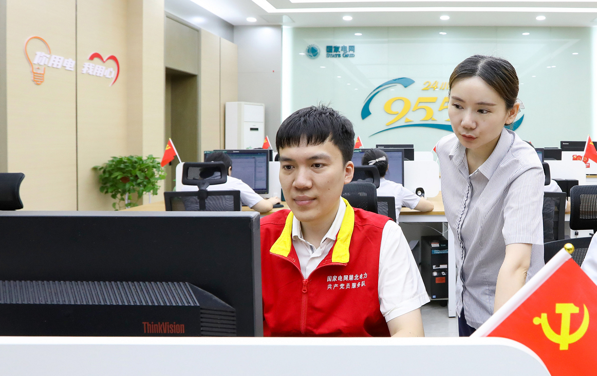 国网湖北电力组织党员职工到95598服务热线工作站开展24小时值守,助力保障全省各地用电需求,在岗位上用实际行动庆祝中国共产党成立100周年。周先保 黄道静 摄