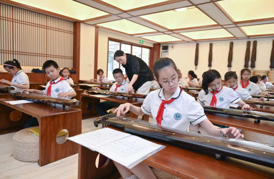 在福州市乌山小学,学生在参加课后古琴兴趣班。新华社记者 宋为伟 摄