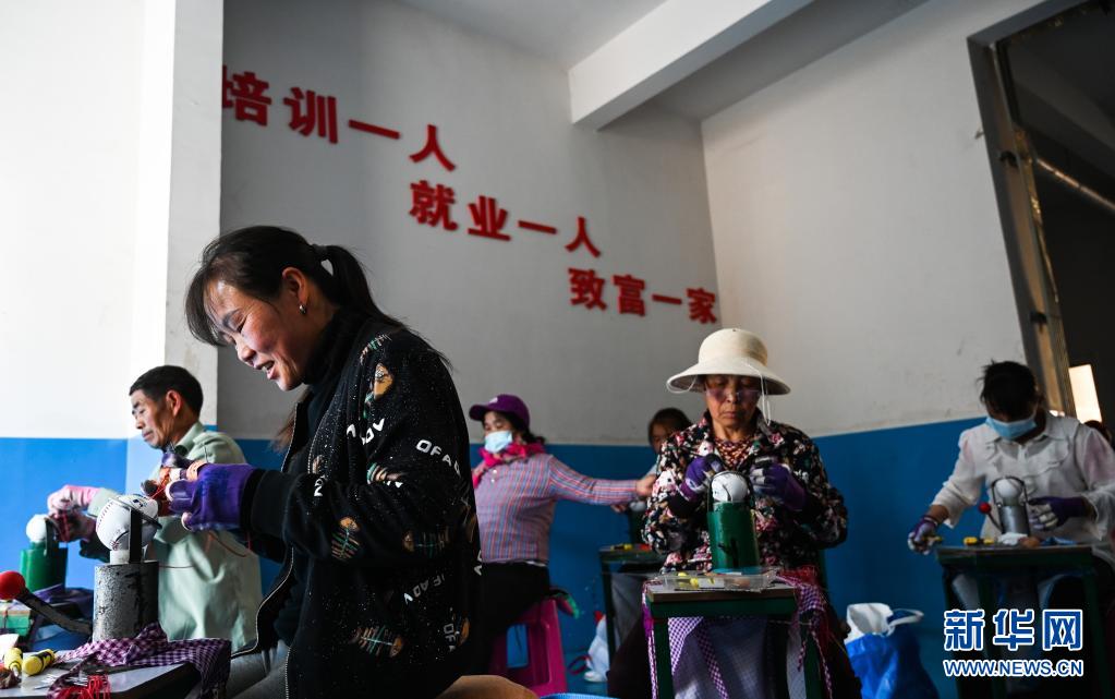 4月26日,搬迁群众在云南会泽新城搬迁安置点棒球制作车间内工作。新华社记者 王冠森 摄