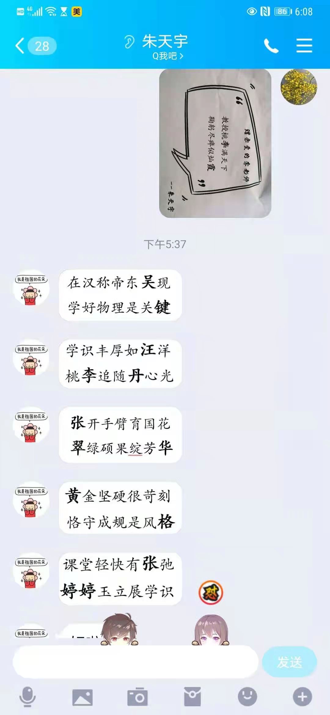 朱天宇表示,自己的中考成绩真的离不开老师们的辛勤付出。“中考结束后,我想感激老师们的辛勤付出,我应该尽我所能去做些什么。由于我之前有写三句半的经历,就想写两句押韵的小诗送给老师们。融入老师的名字是想让诗句有特点,每个老师的诗句都可以代表他们,以此作为毕业时送给老师们的一份有意义的礼物。”
