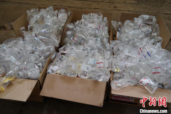 图为“非非”输液用过的成箱的废弃药瓶。 阚力 摄