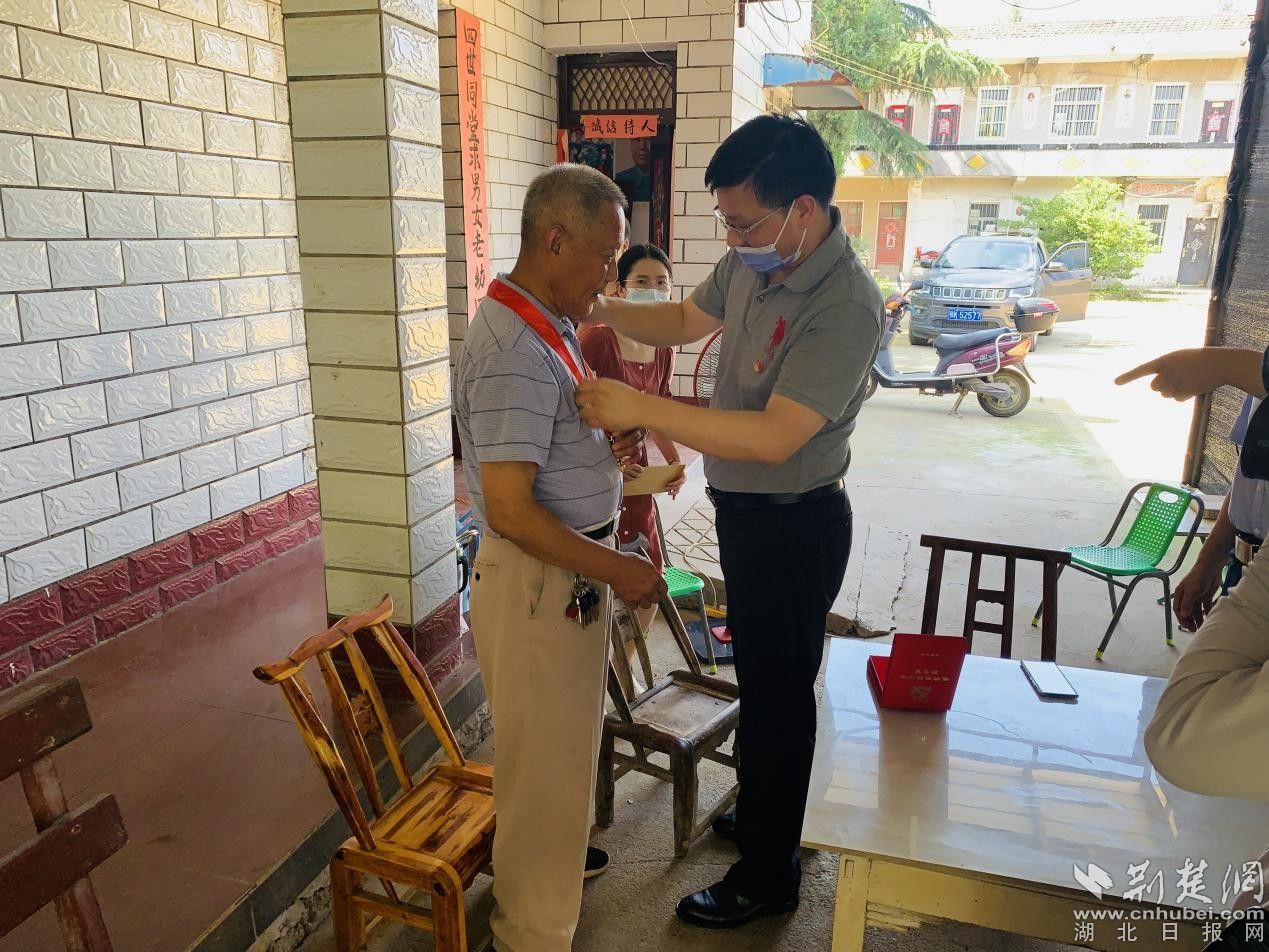 6月22日,在庆祝中国共产党成立100周年来临之际,安陆市市委常委、纪委书记、监委主任周国红来到陈德安家,为他和妻子陈志莲佩戴“光荣在党50年”纪念章。通讯员供图