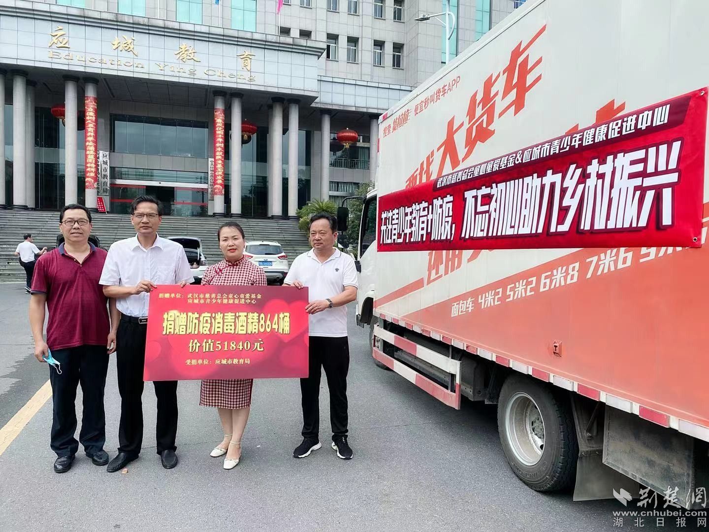 荆楚网(湖北日报网)讯(通讯员程国辉、陈炜)为助力全市各中小学校(园)常态化防疫消杀工作,7月6日下午,武汉市慈善总会童心童爱基金联合应城市青少年健康促进中心,又一次将一批价值51840元的864桶(5L装75%防疫酒精)捐赠给应城市教育局。