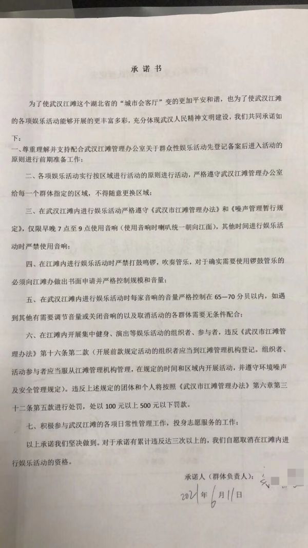 武昌江滩相关负责人告诉记者,大约从2014年开始,武汉三镇江滩开始采用《承诺书》的方式对广场舞等群众性娱乐活动进行管理,要求娱乐活动的组织者、参与者填写登记表进行备案,并在《承诺书》上签字后才能进行广场舞等娱乐活动。