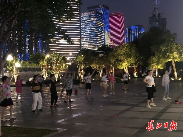 7日19时30分许,长江日报记者来到武昌江滩月亮湾广场,江风徐徐,滨江高楼的灯光秀倒映在江面上。江滩上有不少散步、慢跑的市民,广场上也有一些群众伴随着音乐跳着广场舞。在他们面前的地上,摆放着一只小型音响。