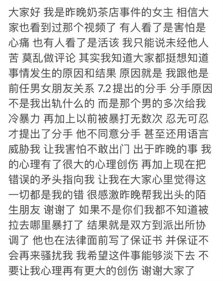 此前极目新闻报道,当事女子与男子系前男女朋友关系。事发后,民警接警后出警,男方在派出所写下了保证书,双方已调解处理,双方都表示不追究责任。