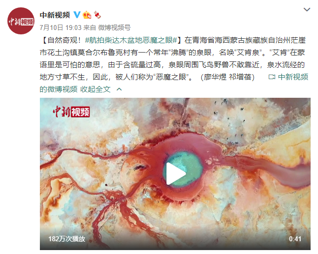 【自然奇观!航拍柴达木盆地恶魔之眼】在青海省海西蒙古族藏族自治州茫崖市花土沟镇莫合尔布鲁克村有一个常年“沸腾”的泉眼,名唤“艾肯泉”。“艾肯”在蒙语里是可怕的意思,由于含硫量过高,泉眼周围飞鸟野兽不敢靠近,泉水流经的地方寸草不生,因此,被人们称为“恶魔之眼”。(廖华煜 祁增蓓)