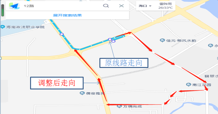 12路优化调整。为弥补椰博路南延长线、儒俊东路的公交线网盲区,满足椰博小学、南江花园等区域居民公交出行需求。