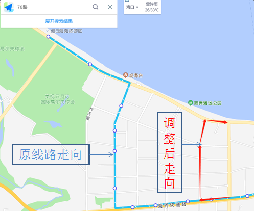 1、增加站点:(1)往程,蓝海路口、天海花园、新海林场、紫园、港澳开发区、祥和家园、秀英区检察院、骨科与糖尿病医院西门、观海台、假日海滩、华府蓝湾北门、五源河学校西门、市消防西海岸中队;(2)返程,市消防西海岸中队、五源河学校西门、华府蓝湾北门、远大购物广场北门、市公安局北门、假日海滩、观海台、骨科与糖尿病医院西门、秀英区检察院、祥和家园、港澳开发区、紫园、新海林场、天海花园、蓝海路口;