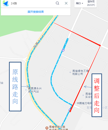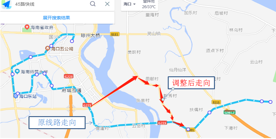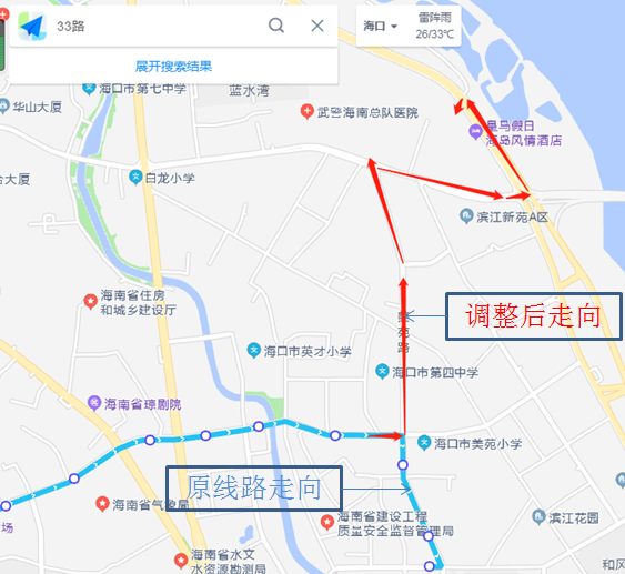 1、增加站点:(1)往程,椰博小学、省公安厅海警总队、琼山区人武部、琼山肉联厂、林村;(2)返程:林村、琼山区人武部、省公安厅海警总队、椰博小学。