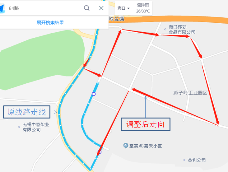 64路优化调整。重点加强狮子岭工业园区内公交线网覆盖,满足企业职工的出行需求。首末班时间调整为狮子岭工业园区首班06:00,末班21:00,省检察院首班06:50,末班22:00。