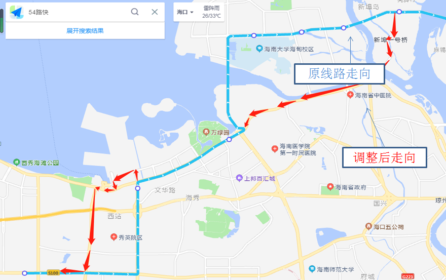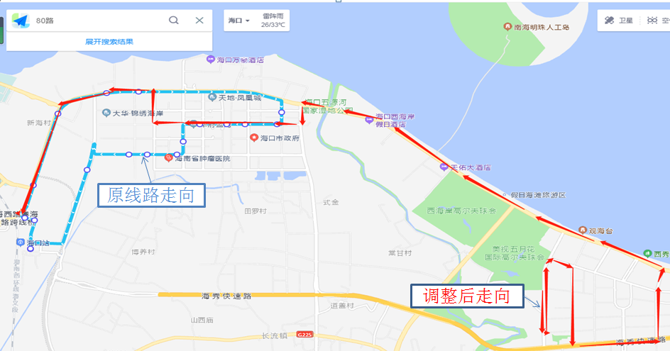 1、增加站点:(1)往程,椰风海岸、后排村、丽景湾别墅、西苑别墅、新世界花园、新东居委会、新埠桥、钟楼、爱华小区、海事局、港口市场、海玻市场;(2)返程:秀英小街、港口市场、秀英港、爱华小区、钟楼、新埠岛、新世界花园、西苑别墅、丽景湾别墅、后排村、椰风海岸、椰海蓝天。