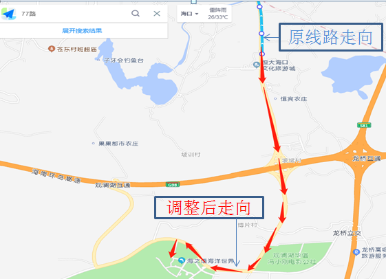 77路优化调整。为加大观澜湖线网覆盖密度,增强线路通达性,满足海南侨中观澜湖学校周边居民的日常出行需求。起讫点调整为“世纪公园至观澜湖北区”,世纪公园首班06:15,末班20:30;观澜湖北区首班07:45,末班21:50。