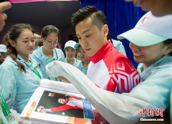 资料图:董栋为志愿者签名。中新社记者 李卿 摄