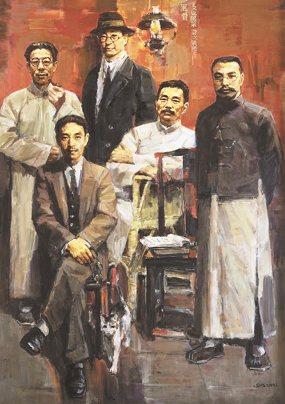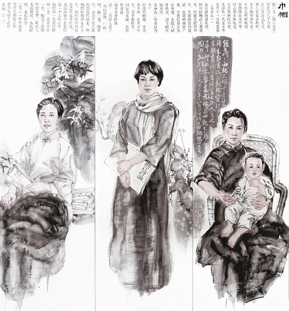参展作品中,李静姝的《小红绳》,展现了下沉人员自创小红绳、小竹篮将物资安全送到独居老人手上,也送去了温暖;韦伶的《巾帼》,淡墨轻描间展现了赵一曼、杨开慧等巾帼英雄值得后人铭记的精神风韵;李思洁的《武汉共产主义小组》,以纯墨表现早期共运领袖的精神风貌;严好好的《星火燎原》,以赤色渲染凸显一个特殊时代;徐谦的《第一个红色县级政权》,还原一个农民运动风起云涌的时代;李洋的《外公的军功章》,借静物讴歌了一段烽火岁月;李达的《战场》,用繁复密闭的医疗现场,于无声处描绘抗疫紧张的战场……
