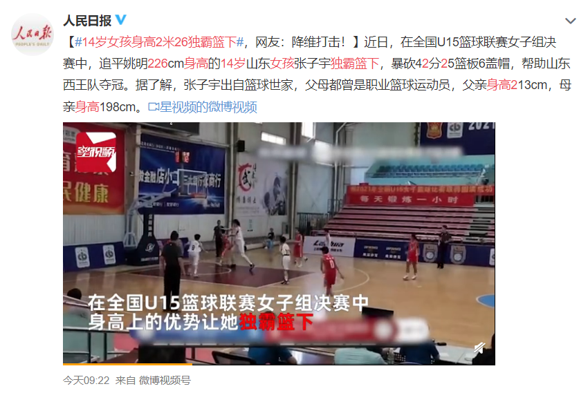 【14岁女孩身高2米26独霸篮下,网友:降维打击!】近日,在全国U15篮球联赛女子组决赛中,追平姚明226cm身高的14岁山东女孩张子宇独霸篮下,暴砍42分25篮板6盖帽,帮助山东西王队夺冠。据了解,张子宇出自篮球世家,父母都曾是职业篮球运动员,父亲身高213cm,母亲身高198cm。