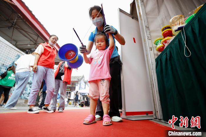 15日,中国潘家园第一届非遗文化节在北京潘家园旧货市场开幕。图为一名女孩学习抖空竹。 中新社记者 富田 摄