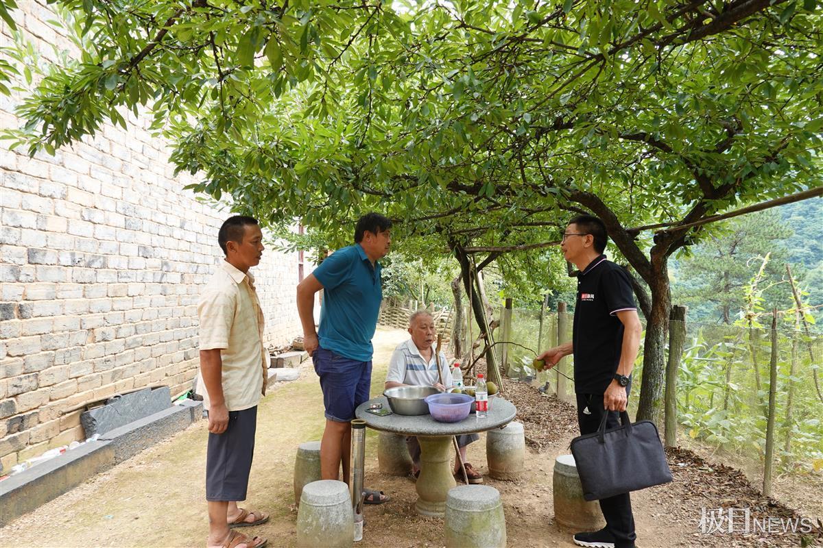 坐在潘明清家旁边的一处石桌前,虽烈日当空,但在桃树阴下,拂面吹来的却是阵阵凉风,与山下热浪滚滚形成鲜明的对比。