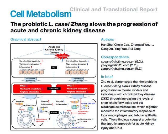 7月15日,国际著名学术期刊《Cell Metabolism》(《细胞代谢》,该期刊2020年影响因子为27.287)发表了同济医院肾内科、临床营养科研究团队这一最新研究成果:益生菌干酪乳杆菌Zhang延缓急、慢性肾脏病进展。肾内科朱菡医师、曹楚瑾博士为共同第一作者,姚颖教授、徐钢教授和曾锐副教授为共同通讯作者。