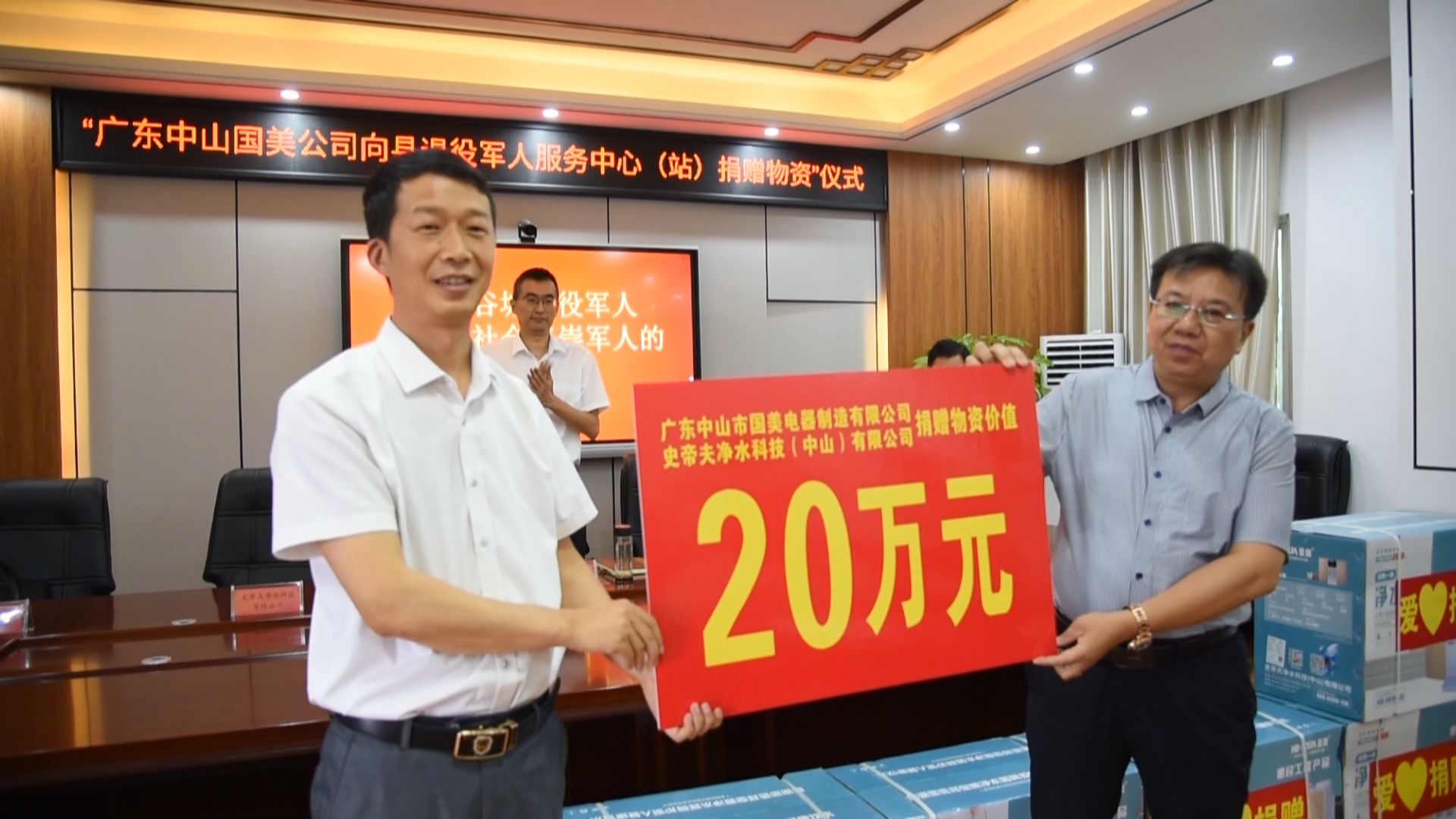广东中山市国美电器制造有限公司、史帝夫净水科技(中山)有限公司两家爱心企业将为全县303个县、乡镇(开发区)、村(社区)退役军人服务站(中心)全覆盖安装一批太阳能环保路灯和健康净水机,进一步改善生活办公环境,让老兵们“回娘家”更有归属感。