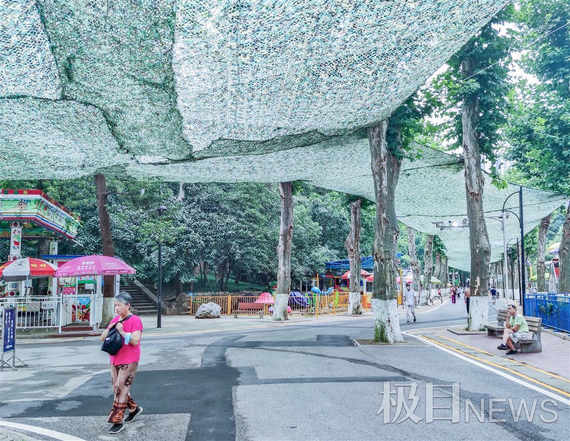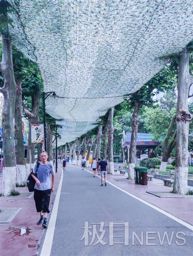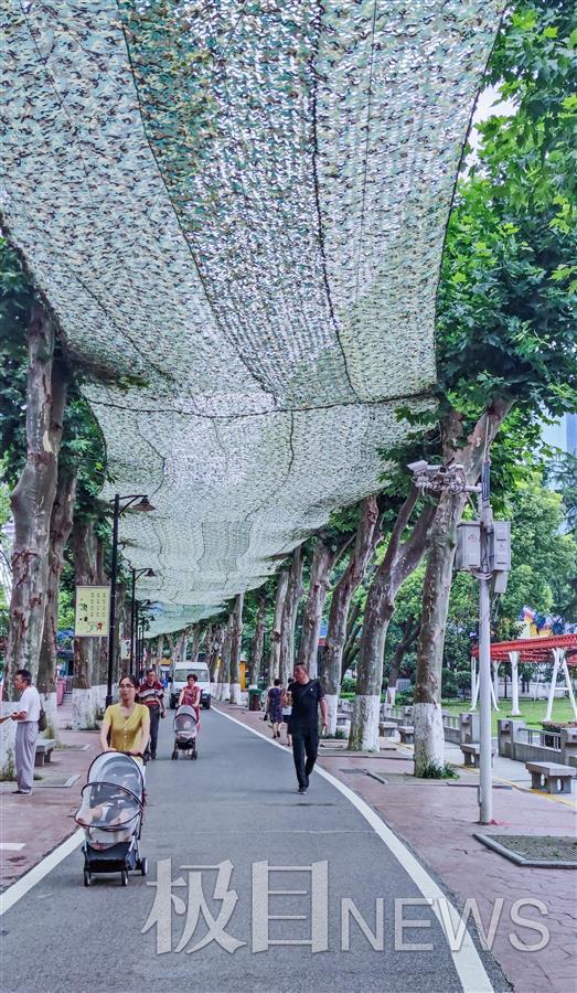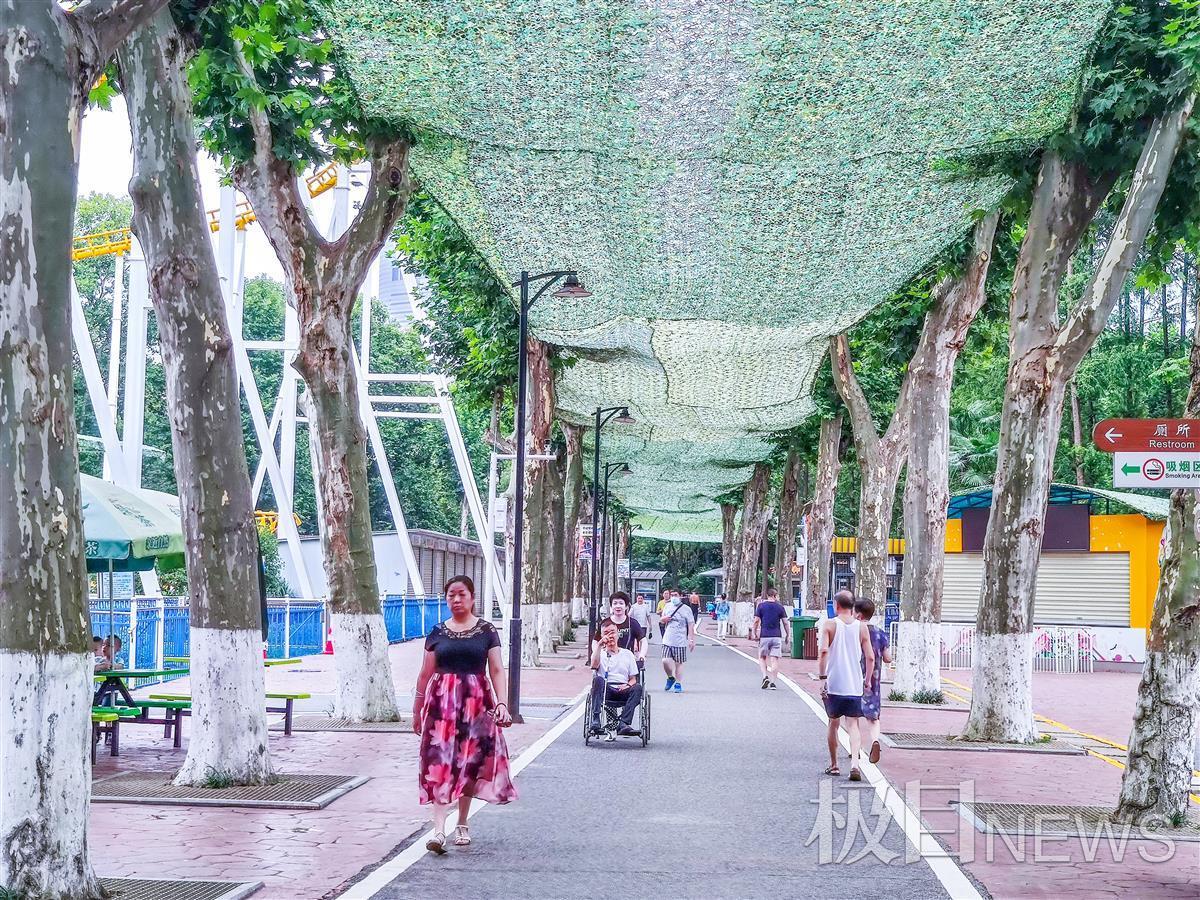 7月16日,市民和外地游客,在汉口中山公园林荫道上行走时,发现道上已加装了防晒网,公园此举得到了广大市民和游客点赞。