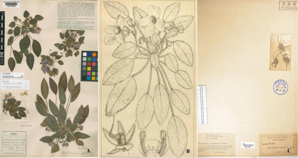 长期以来,大花石蝴蝶的庐山真面目一直难以确定。国家标本平台仅能查到两份大花石蝴蝶的标本,其中一份为陈焕镛先生从英国皇家植物园邱园标本馆交换而得,标本并不完整,仅有几个叶片和脱落的花;而另外一份标本实为石蝴蝶属其他种类。