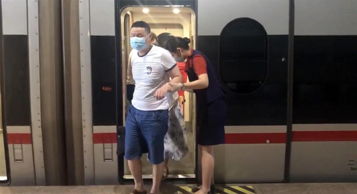 到站前五分钟,熊婧和张思巧来到肖先生身边,让他在座位上等候,等待其他旅客走后再来带领他们下车。到站后熊婧亲自和车站值班员办理交接,张思巧带领着他们下车,将他们的手交到值班员的肩膀。看着他们离开的背影,耳边还是他们不断感谢的声音。