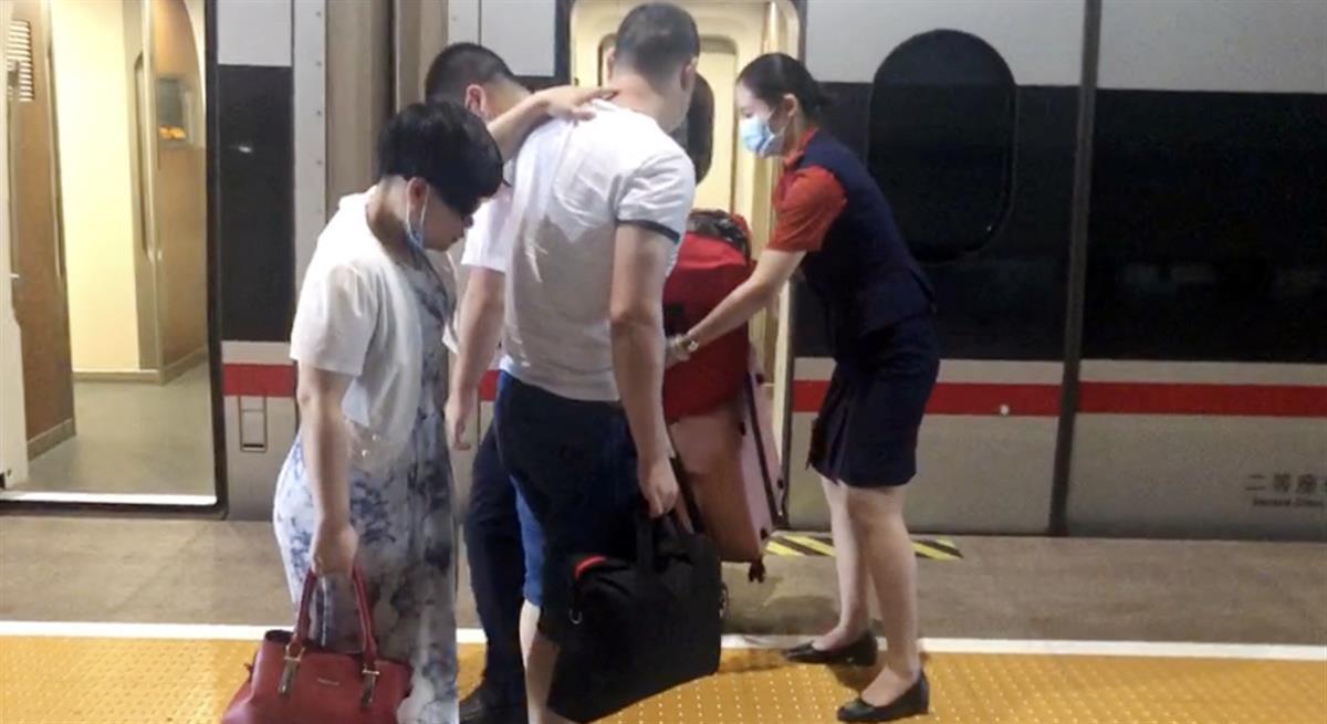 9时32分,列车驶出站台。列车长熊婧和列车员张思巧第一时间找到两位旅客,给他们送去矿泉水,询问需求。肖先生说他和爱人是去上海就医的,也是第一次坐这么远的车,有点紧张。熊婧安慰道:“您放心,我们已经提前给您联系好了上海虹桥站,到站会有人来引导您,途中有停站不要下车,有什么需求您随时告知我们,列车比较晃动如果您要去洗手间就联系列车员,她会帮助您。”列车行进途中,列车员张思巧特别留意这对盲人夫妇,帮助他们点餐送餐、上卫生间,并第一时间响应他们各种需求。