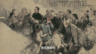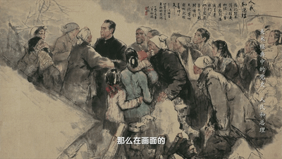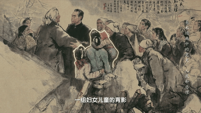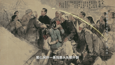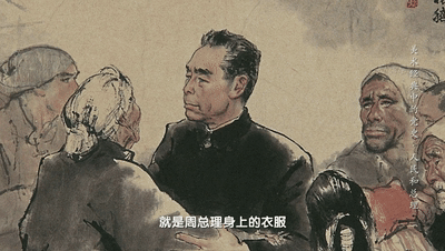 画面中心位置的一组妇女儿童的背影,以彩墨渲染,位置紧邻总理,既调节了画面以黑灰为主的色调,也是对重要人物的视觉提示。