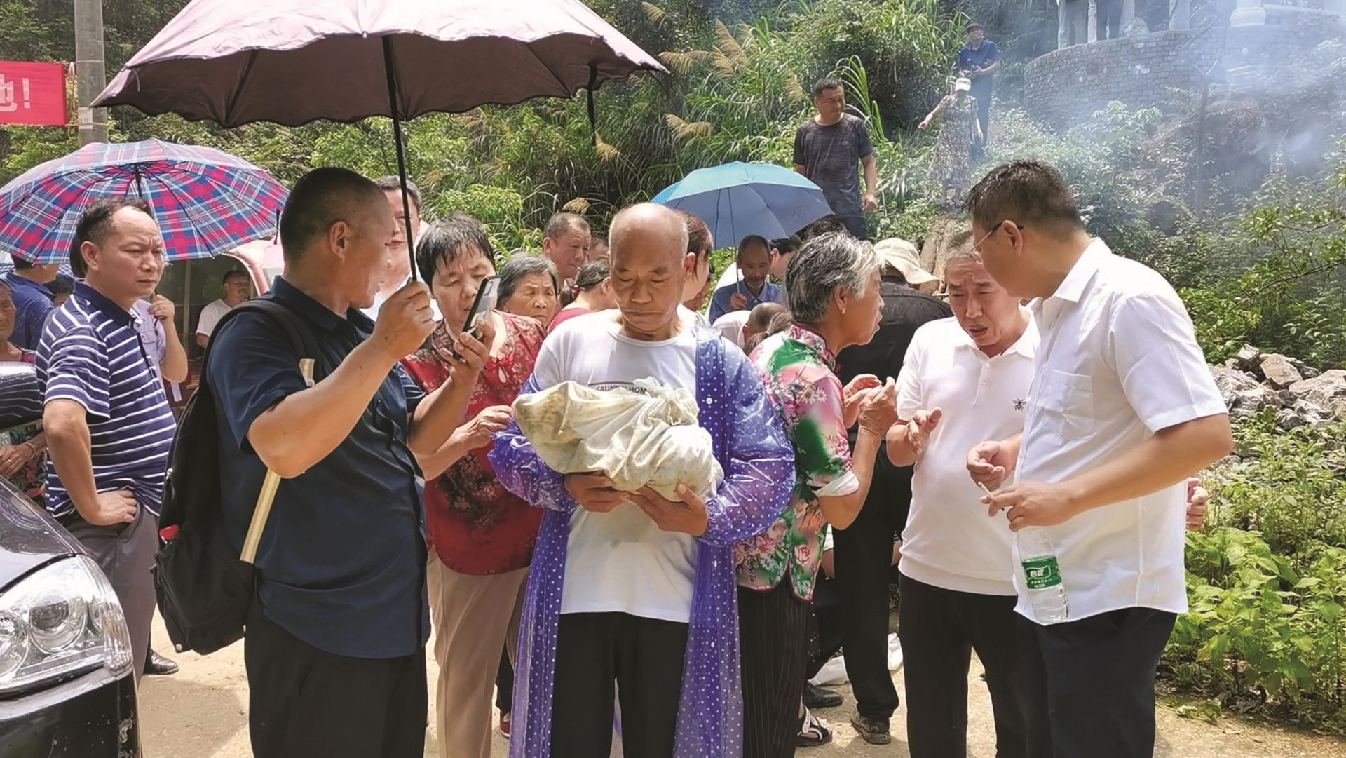 乔爱民怀抱乔凤山烈士的遗骨与吴家人站在村口话别