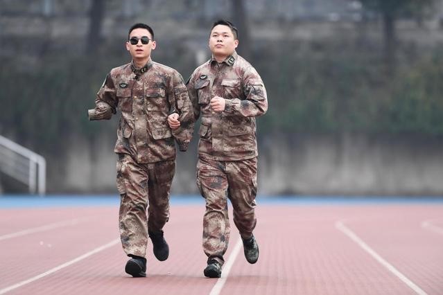 “排雷英雄战士”杜富国(左)和战友在陆军军医大学操场上跑步。新华社记者 王全超摄